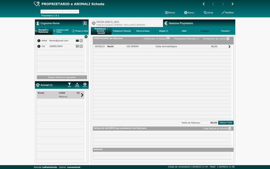 Questo è il modulo base di VET report dove vengono visualizzate riepilogate tutte le informazioni riguardanti il proprietario e tutti i suoi animali.